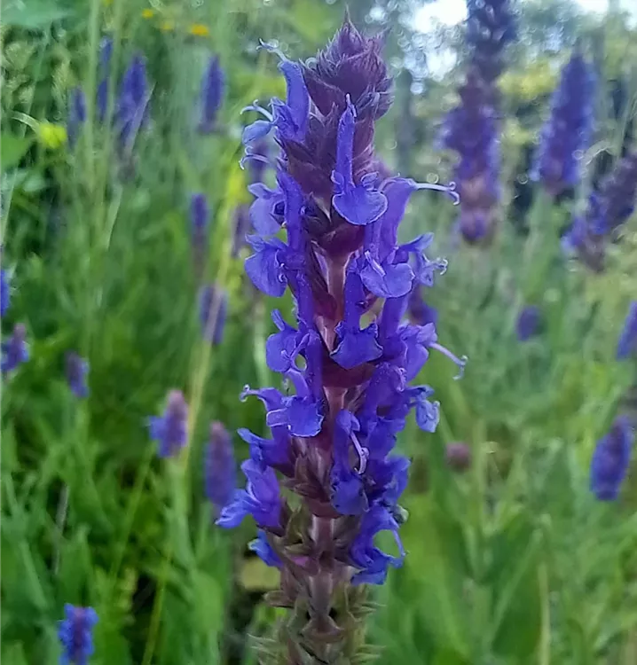 Idealer Salbei für Beete und Rabatten: Mit seinen aufrechten, langen Blütenkerzen in leuchtendem Violett ist der Steppen-Salbei eine Bereicherung für jeden Garten. Er hat eine tolle Fernwirkung, blüht lange und remontiert. D.h. nach der Blüte kann man ihn zurückschneiden und er entwickelt nochmals einen zweiten Blütenflor. Steppen-Salbei wächst schön buschig, bildet aber keine störenden Ausläufer. Seine aufrechten Stängel sind dicht belaubt mit dunkelgrünen, lanzettlichen Blättern, die einen gesägten Blattrand haben. Zerreibt man sie zwischen den Fingern, duften sie angenehm und sehr aromatisch. Die endständigen, schmalen Blütenstände des Steppen-Salbeis sind zudem ein wahrer Bienen- und Schmetterlingsmagnet. Am schönsten wirkt er in größeren Gruppen gepflanzt. Oder wenn er in wellenförmigen Bändern das Beet durchzieht und zusammen mit Silene vulgaris (Taubenkropf-Leimkraut) und Geranium sanguineum (Blutroter Storchschnabel) um die Wette strahlt.