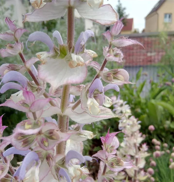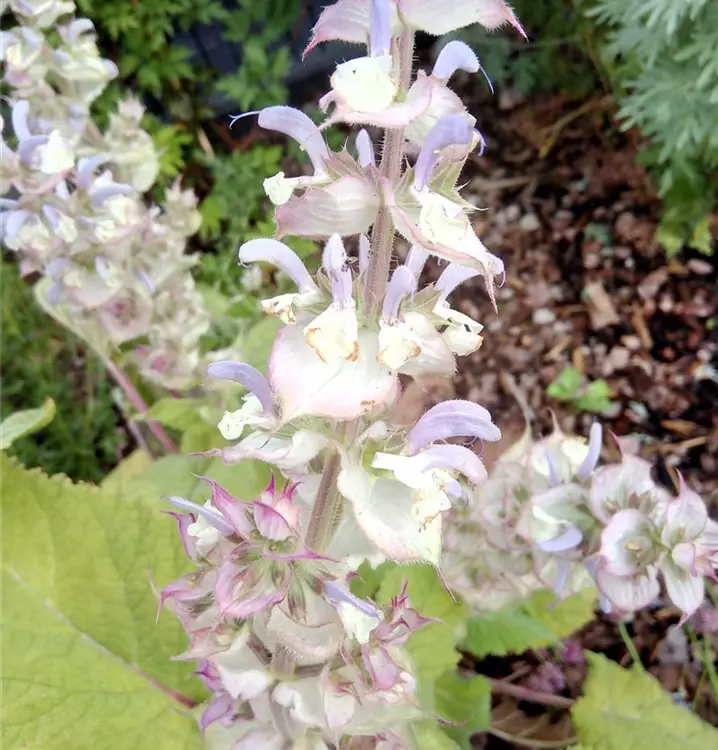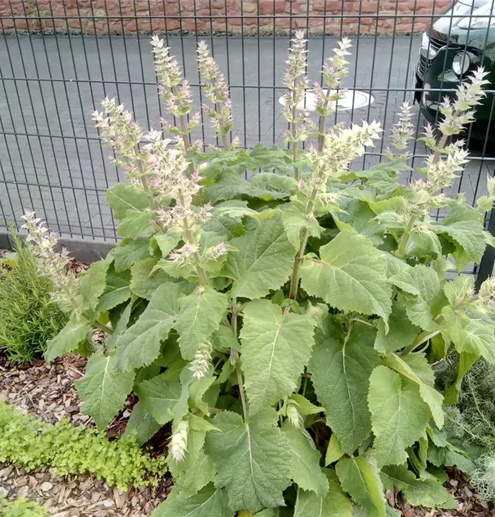 Sieht toll aus und verströmt einen intensiven Duft: Der Muskateller-Salbei ist eine kurzlebige Pflanze, die sich im Garten jedoch zuverlässig durch Selbstaussaat erhält. Im ersten Jahr wird eine Blattrosette aus großen, herzförmigen Laubblättern gebildet, die klebrig behaart sind. Darüber erhebt sich im zweiten Jahr ein stabiler, aufrechter Stängel, der einen imposanten, verzweigten Blütenstand in Form einer Scheinähre trägt. Die rötlich bis lilafarbenen Einzelblüten sind nicht nur besonders dekorativ im Beet, sondern auch essbar. Man kann sie, ebenso wie die Blätter, roh und gekocht verwenden und an Salate, Gemüse oder Fleischgerichte geben. Die Blüten sind auch eine tolle Dekoration für Desserts oder bereichern mit ihrem aromatischen Duft Potpourris und Duftkissen. Der Muskateller-Salbei hat, wie zahlreiche Verwandte aus der Salbei-Familie, heilkräftige Wirkung. Die kannten schon die alten Griechen und Römer, die ihn z.B. gegen Kopfschmerzen einsetzten. Zur Teezubereitung werden die blühenden Sprossspitzen (2 g auf 100 ml Wasser) verwendet, die verdauungsfördernd und krampflösend wirken und bei Husten helfen sollen. Äußerlich wird ein Aufguss gegen Zahnfleischentzündung angewendet. Muskateller-Salbei behält auch nach der Blüte noch sein attraktives Aussehen und kann gut mit Verbascum densiflorum (Großblütige Königskerze) und Anthemis tinctoria Alba (Färber-Hundskamille) kombiniert werden. Gute Bienenweide.