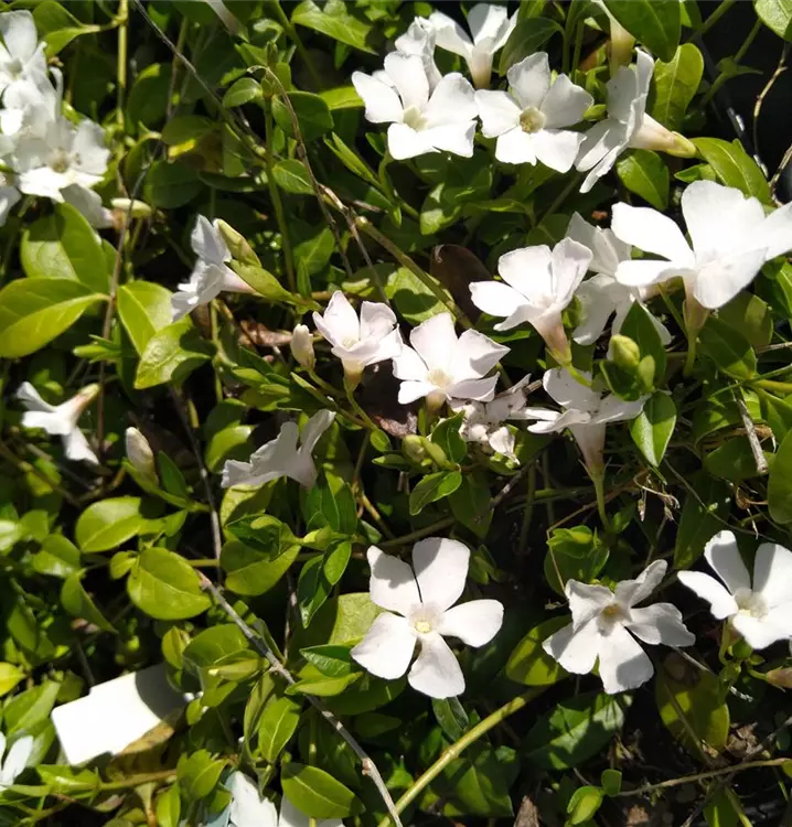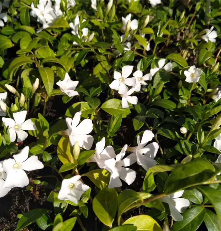 Das Weiße Kleine Immergrün bildet lange, verzweigte Triebe, die an den Spitzen neue Wurzeln bilden. In kurzer Zeit entstehen so dichte, bodendeckende Bestände. Die etwas derben, breit lanzettlichen Blätter sind dunkelgrün und glänzend. Zur Blütezeit sind die Teppiche dieses Kleinen Immergrüns gespickt mit weißen Sternblüten. Das sieht gut aus zwischen höheren Stauden. Besonders schön sind auch eingewachsene Bestände unter und bei lichten Gehölzen. Zudem ist diese Sorte deutlich robuster und ausdauernder als die Ursprungsart. Für die pflegeleichte Bepflanzung von Gräbern geeignet.
