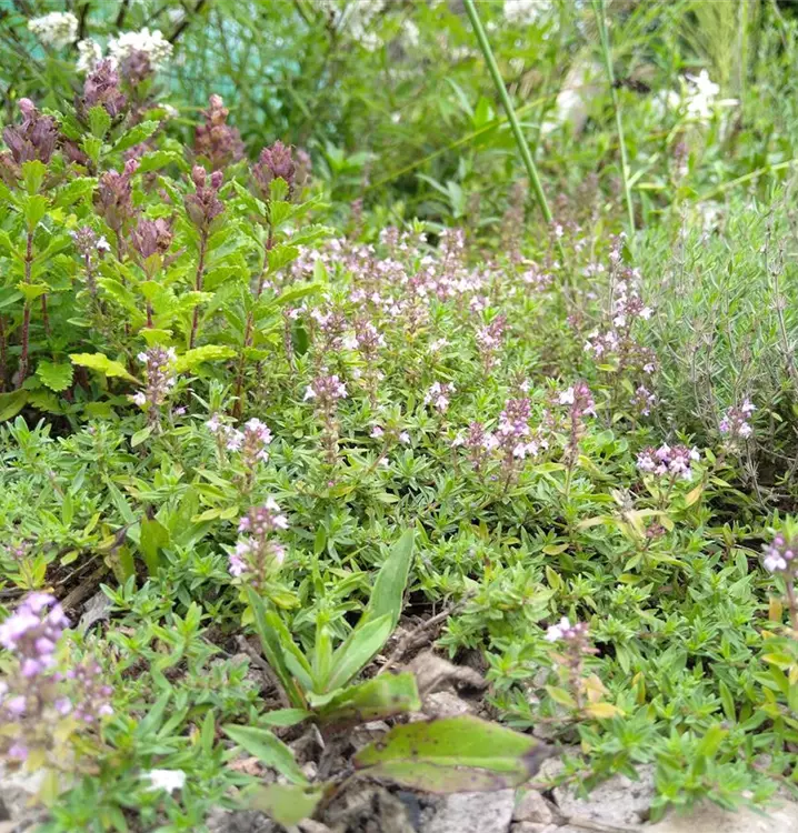 Für einen bekömmlichen Husten-Tee: Sand-Thymian wirkt schleimlösend und bringt daher, als heißer Tee getrunken, schnelle Linderung. Bei Bedarf kann man mit Honig süßen. Auch als Würzkraut in der Küche ist das kleine Pflänzchen einsetzbar und (frisch oder getrocknet) lecker in Salaten, Eintöpfen, Kartoffelgerichten, Weichkäse und Braten. Pizza, Tomatensoße oder Kräuterbutter verleiht Sand-Thymian einen besonderen Pfiff. Man erntet das Kraut während der Blüte und verwendet sowohl die kleinen, linealischen Blättchen als auch die rosa Lippenblütchen. Der Sand-Thymian entfaltet sein Aroma am intensivsten, wenn er sonnig und trocken steht. Im Garten sind daher Ränder von Kieswegen, Mauerfugen und Schotterflächen hinter Trockenmauern ideale Standorte. Mit der Zeit wächst er zu überreich blühenden Polstern heran, die im Sommer beliebte Tummelplätze für Schmetterlinge und Wildbienen sind. Passt gut zu Veronica prostratra (Liegender Ehrenpreis) und Potentilla argentea (Silber-Fingerkraut). Immergrün.