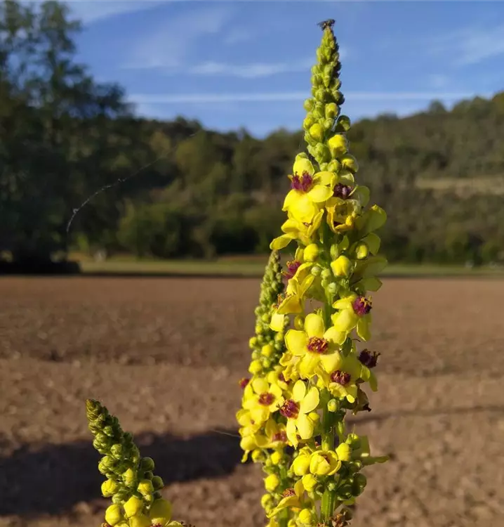 Wichtige Heilpflanze bei Husten: Für einen lindernden, schleimlösenden Tee nimmt man Blätter und Blüten. Äußerliche Anwendungen helfen gegen Prellungen und Entzündungen der Haut. Die zweijährige Schwarze Königskerze bildet einen dichten Blattschopf aus langgestieltem, frischgrünem Laub. Ihre großen, herzförmigen Blätter sind oberseits kahl, unterseits filzig behaart. Weiter oben ist das Laub kleiner und länglich-eiförmig. Von stabilen, unverzweigten und zumeist rötlich überlaufenen Stängeln getragen erscheinen dann kerzenartige Blütenstände. Sie schmücken sich überreich mit gelben Schalenblütchen, in deren Mitte strahlend violette Staubgefäße sitzen. Die von oben nach unten aufblühenden Blütenstände passen in naturnah gestalteten Flächen mit Wiesencharakter gut zu Salvia nemorosa (Steppen-Salbei) und Anthemis tinctoria Alba (Färber-Hundskamille in weiß). Auch im sonnigen Staudenbeet und bei lichten Gehölzen ist die Schwarze Königskerze immer ein Hingucker. Die Blütenstände kann man nach dem Verblühen an der Pflanze belassen. Sieht im Winter gut aus im Beet und hilft der Pflanze, sich durch Selbstaussaat zu erhalten.