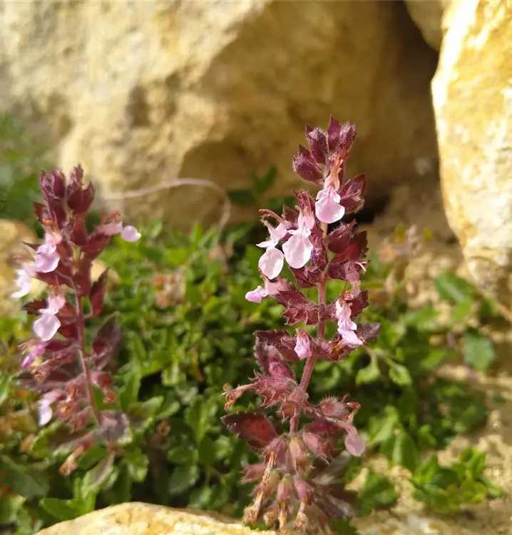 Schöne Staude für die Dachbegrünung: Der aromatisch duftende Edel-Gamander macht sich mit seinem kompakten Wuchs aber auch gut im Vordergrund von sonnig trockenen Staudenbeeten, z.B. zusammen mit Helianthemum nummularium (Gewöhnliches Sonnenröschen) und Gypsophila repens (Kriechendes Gipskraut) gepflanzt. Seine rosa Lippenblüten sitzen in lockeren, quirlartig gehäuften Blütenständen oben am Stängelende zusammen. Auch in den oberen Blattachseln erscheinen einige kleine, sitzende Blütchen. Die aufrechten, verzweigten Stängel des Edel-Gamanders sind locker bis in die Blütenstände mit ovalen Blättern besetzt, deren Blattränder deutlich gekerbt sind. Sie fühlen sich etwas derb an und bleiben auch im Winter grün. Die Pflanze verholzt am Grunde etwas, bildet Ausläufer und wächst mit der Zeit zu ansehnlichen Beständen heran. Die Volksheilkunde verwendet den Edel-Gamander in verschiedenen Zubereitungen zur Stärkung der Verdauung, gegen Gicht und Husten. Von der innerlichen Anwendung des Edel-Gamanders ist aus heutiger Sicht aber abzuraten, da er schädigend auf die Leber wirken kann. Gute Bienenweide.