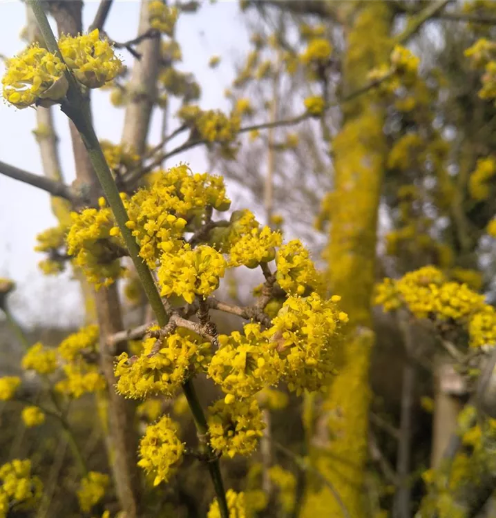 Die Kornelkirsche hat sehr zahlreiche deutsche Bezeichnungen wie Dirlitze, Herlitze oder Korlesbeere.