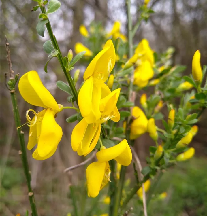 Schnell wachsender, aufrechter Rutenstrauch, welcher später ohne Rückschnitt überhängt und bis 2 m hoch wird. Seine fünfkantigen, grünen, später grauen Zweige sind lang und besenförmig. Die dreiteiligen verkehrt-eiförmigen Laubblättchen sind leicht behaart und wechselständig angeordnet. Für ca. 3 Wochen im Mai/Juni lockt eine dottergelbe Blütenpracht Bienen und Hummeln an. Die ca. 2 cm großen Schmetterlingsblüten bilden später schwarze Hülsenfrüchte. Durch seine starken Pfahlwurzeln eignet sich der Strauch als Erstbepflanzung. Der Boden sollte kalk- und nährstoffarm sein. Verwendung als Gruppengehölz sowie als Einzelpflanze und zur Bodenbefestigung.