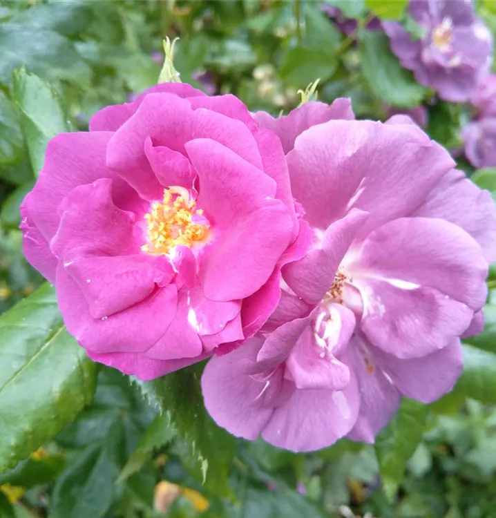 Wuchs buschig, 100 bis 160 cm hoch und auch so breit, überhängend. Kleine gesunde Blätter.Üppige, leicht gefüllte, kleine (4 cm) fliederfarbene Blüten mit gelben Staubgefäßen. Die Blüten duften leicht und erscheinen zahlreich und in Büscheln von Juni bis September/Oktober. Im Verblühen färbt sich die Blüte zart violett. Hagebutten????. Als Einzelstrauch, Beet- oder Heckenrose geeignet.