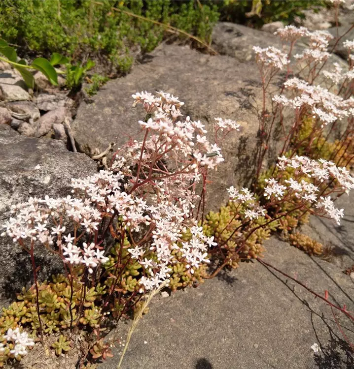 Kann in der Küche verwendet werden: Vor der Blüte geerntete, junge Triebe können roh an Salate oder gekocht zu Gemüsegerichten gegeben werden. Zudem ist der Weiße Mauerpfeffer eine beliebte Futterpflanze für Schmetterlinge, zum Beispiel für den seltenen Apollofalter. Auch vielerlei Wildbienen-Arten und Fliegen besuchen gerne seine nektarreichen, weißen Sternblütchen, die in kugelig gehäuften Blütenständen beisammen sitzen. Die Triebe wachsen flach am Boden entlang und verzweigen sich etwas. Sie sind dicht besetzt mit länglich-rundlichen, sukkulenten Blättern, die auch den Winter über grün bleiben. Weißer Mauerpfeffer macht sich toll im Steingarten oder wenn er wasserfallartig von Trockenmauerkronen herunter kriecht. Man kann ihn im Kübel als Unterpflanzung nutzen. Oder für die extensive Dachbegrünung einsetzen. Oder im schottrigen Kräuterbeet zusammen mit Thymus vulgare Compactum (Aromatischer Echter Thymian) und Statureja montana (Berg-Bohnenkraut) pflanzen. Die Einsatzmöglichkeiten der robusten und vitalen Staude sind zahlreich.
