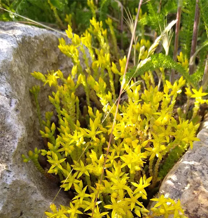 Zuverlässiger Bodendecker für kleinere Flächen: Zum Beispiel bei der Begrünung von Dächern, zusammen mit Gypsophila repens (Krichendes Gipskraut) und Briza media (Mittleres Zittergras). Hier wächst der kriechende Milde Mauerpfeffer mit der Zeit zu ansehnlichen Beständen heran. Er gedeiht auch gut im Steingarten und auf Trockenmauern, wo er in der kleinsten Ritze Halt findet. Die zahlreichen Triebe des Milden Mauerpfeffers sind dicht besetzt mit sattgrünen, fleischigen Blättchen. Man kann sie roh oder gekocht verwenden. Zunächst leicht zerquetschen und dann an Salate, Gemüsegerichte und Suppen geben. Sehr fein. Für die Verwendung in der Küche erntet man die jungen Triebe vor der Blüte. Die gelben Sternchenblüten, mit denen sich der Milde Mauerpfeffer zur Blütezeit überreich schmückt, sind nicht genießbar. Gedeiht auch gut im Kübel. Gute Bienenweide.