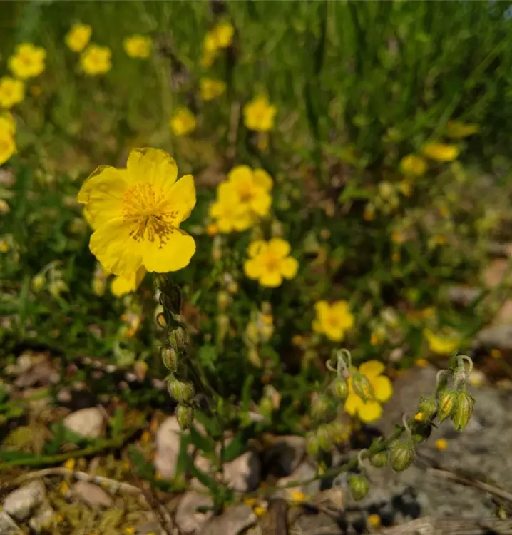 Ausdauernder Sommerblüher: Wenngleich die einzelne Blüte nur sehr kurzlebig ist. Sie blüht morgens auf und verliert bereits am Nachmittag ihre Blütenblätter. Es erscheinen aber den ganzen Sommer über unentwegt neue, strahlend gelbe Blütchen. Die fünfzähligen Blüten sitzen in traubigen Blütenständen zusammen und krönen die verzweigten, oft rötlich überlaufenen Stängel. An der Basis verholzt das Gewöhnliche Sonnenröschen etwas. Die ledrigen Laubblätter sind länglich lanzettlich, wintergrün und leicht behaart. Die halbstrauchig wachsende Wildstaude ist eine gute Wahl für den Steingarten, besonders in Kombination mit Thymus praecox (Frühblühender Thymian) und Pulsatilla vulgaris (Gewöhnliche Kuhschelle). Man kann sie auch als Einfassungspflanze im Beetvordergrund oder auf Trockenmauern verwenden. Gedeiht gut im Kübel oder Topf.