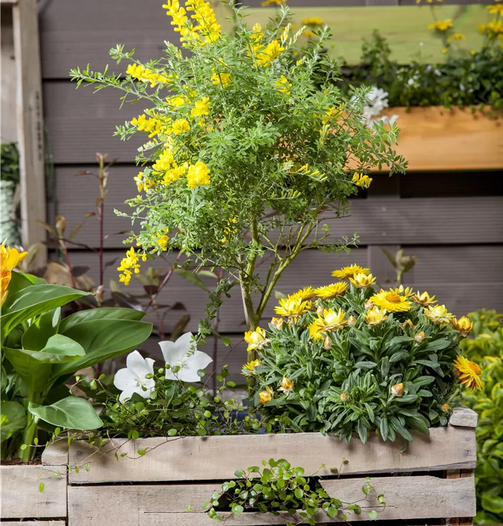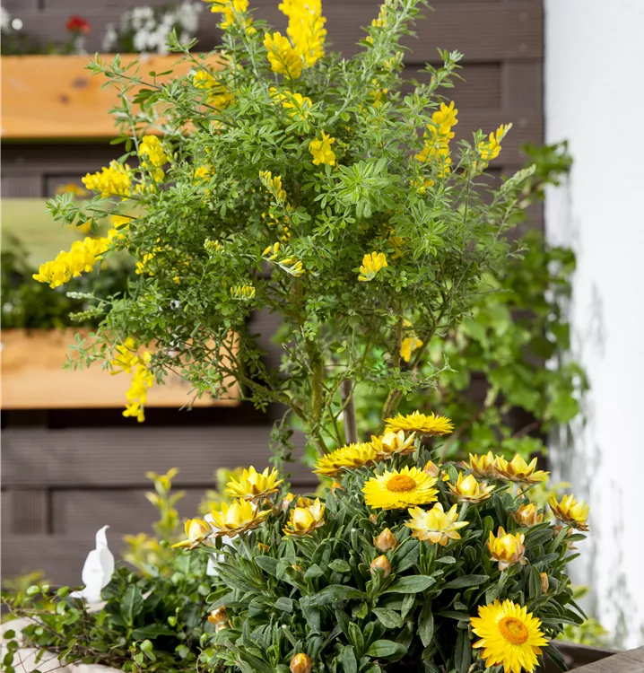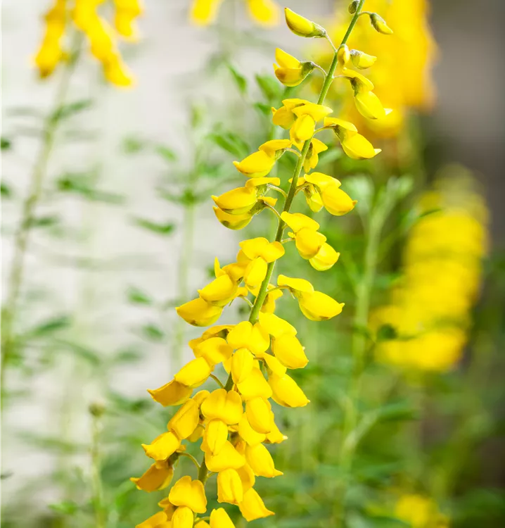 Der Schwarze Geißklee wird auch Schwarzer Bohnenstrauch oder Trauben-Geißklee genannt. Von Juni bis August erscheinen an 10 - 30 cm langen Trauben die gelben, endständigen Schmetterlingsblüten. Ab Juni sind daraus anliegend behaarte Hülsen geworden. Beim Vertrocknen verfärben sich alle Teile der Pflanze schwärzlich. Die Zweige sind reich verzweigt und wachsen ca. 0,5 - 1 m in die Höhe. Das Blatt ist wechselständig, dreiteilig gefiedert und glattrandig. Die kriechenden Wurzeln können oberirdisch grüne Triebe wachsen lassen. Der Strauch ist kalkverträglich und kommt mit steinigen und trockenen Böden zurecht (siehe unsere Pakete 3.02 Zwerggehölze für den sonnigen Gehölzrand und 3.04 Zwerggehölze für den Heidegarten). Verwendbar als Gruppengehölz oder in Wildstaudenpflanzungen.