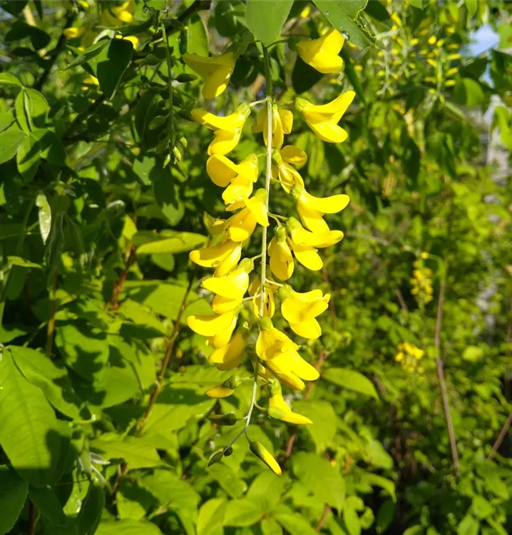 Eine trichterförmig wachsende baum- bzw. strauchartige Pflanze, die mit einer Wuchshöhe bis 7 m beschrieben wird. Unserer Erfahrung nach wird eine Höhe von 4,5 m nicht überschritten. Die Seitenäste sind dünn, aufrecht und überhängend. Der Großstrauch lässt uns bereits im Mai/Juni mit gelben Blüten an ca. 20 cm langen Blütentrauben (duften nicht) den Frühling spüren. Sie bilden ab September grün-graue Hülsen, die über den Winter hängen bleiben. Die olivgrüne Rinde wird später grau-grün und das dreifingerige Laub wird ca. 8 cm lang. Die dicken, fleischigen Wurzeln verlassen nicht den Umkreis der Kronentraufe. Der Goldregen ist kalkliebend, mag es schwach sauer bis stark alkalisch (pH-Wert über 7,4) bei sandig-steinigen bis humosen Lehmböden. Kurze starke Trockenheit oder auch leichte Nässe sind kein Problem. Von einem Verjüngungsschnitt ist abzuraten.