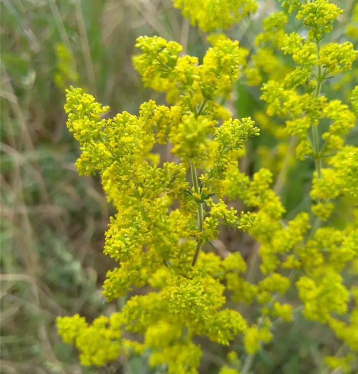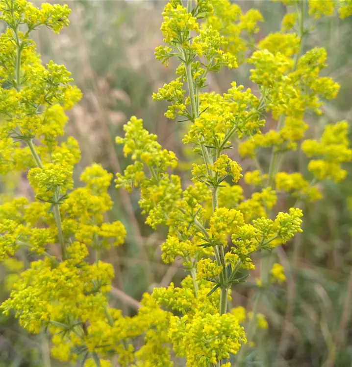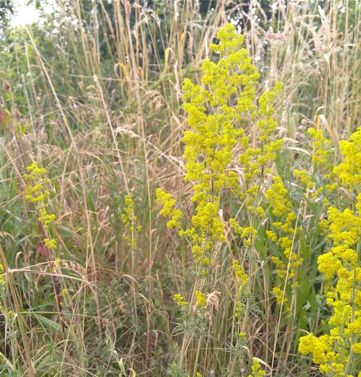 Herrlich gelbe Blüten mit aromatischem Honig-Duft: Das Echte Labkraut wird in der Volksheilkunde wegen seiner heilenden und kräftigenden Effekte geschätzt. Es wirkt positiv auf Bauchspeicheldrüse, Blase, Haut, Leber und Nieren. Man sammelt das Kraut im blühenden Zustand und setzt es frisch oder getrocknet ein. Verwendung der Blätter als Beigabe zu Salat oder Gemüse Die Samen können geröstet verzehrt werden. Die äußere Anwendung erfolgt idealerweise als Frischblattauflage. Für Waschungen und Umschläge geht aber auch ein Absud. Für die innere Anwendung eignet sich ein Teeaufguss. Neben diesen vielfältigen Eigenschaften punktet das Echte Labkraut aber auch als zierendes Element im Stauden- oder Kräuterbeet. Das unterseits weich behaarte, linealisch-spitze Laub steht in den für die Labkräuter charakteristischen Quirlen. Die Blütenstände sind vielblütig, dicht und rispenartig. Sie haben eine tolle Fernwirkung und passen gut zu Salvia pratensis (Wiesen-Salbei), Leucanthemum vulgare (Magerwiesen-Margerite) und Origanum vulgare (Gewöhnlicher Dost).