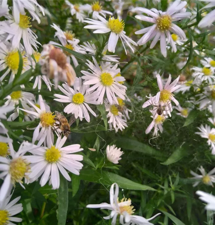 Weißblühende Auslese der nordamerikanischen Wildform: Die Kissen-Astern breiten sich über einen kriechenden Wurzelstock aus und bilden, wie der Name schon andeutet, dichte Kissen. Das macht sie zu einer beliebten bodendeckenden Staude für flächige Steingartenpflanzungen. Auch als Einfassungspflanze für Rabatten und Beete in nicht zu warmer Lage hat sie sich mit ihrem kompakten, rundlichen Wuchs bestens bewährt. Der dankbare Dauerblüher kann zudem als dekorative, pflegeleichte Grabbepflanzung eingesetzt werden. Die weißen, feinstrahligen Körbchenblüten dieser Sorte, mit der für Astern charakteristischen gelben Mitte, heben sich besonders gut ab vom dunkelgrünen, lineal-lanzettlichen Laub. Im Verblühen färben sich die Blüten rosa. Die dichten, überreich blühenden Blütenstände dieser vitalen Auslese sind doldig verzweigt und wirken toll in Kombination mit Gräsern. Empfehlenswerte Begleitstauden sind Quirlblättr. Mädchenauge (Coreopsis verticillata), China-Schilf (Miscanthus sinensis), Wiesen-Bärenklau (Heracleum sphondylium), Purpur-Astilbe (Astilbe chinensis var. taquetii Purpurlanze). Die ungefüllten Kissen-Astern sind als Spätblüher wichtige Nahrungsquelle für viele Bienen und Insekten, die sich auf den Winter vorbereiten. Gute Schnittblume.