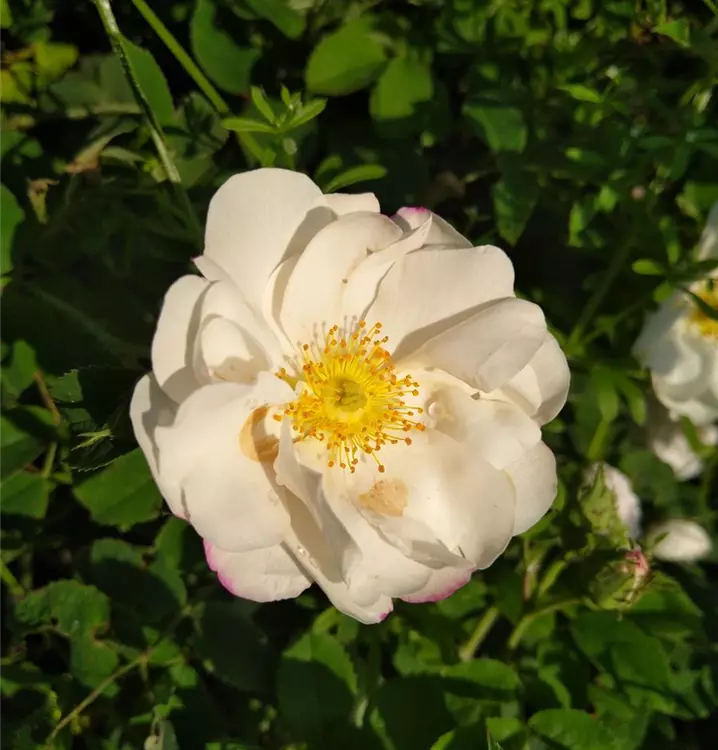 Lockerer Wuchs bis 200 cm Höhe und bis 120 cm Breite. Derbe, duftende Blätter an stachligen Zweigen. Im Mai/Juni rahmweiße, an den Rändern rot getönte Blüten, die sich nachts schließen. Halbgefüllt und stark duftend. Reicher Fruchtbehang mit roten Hagebutten im Spätsommer. Für Hecken geeignet.