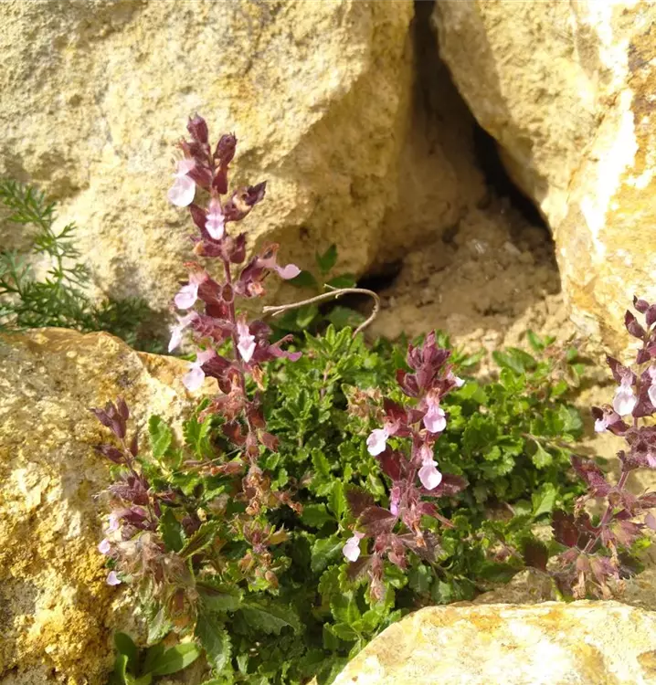 Schöne Staude für die Dachbegrünung: Der aromatisch duftende Edel-Gamander macht sich mit seinem kompakten Wuchs aber auch gut im Vordergrund von sonnig trockenen Staudenbeeten, z.B. zusammen mit Helianthemum nummularium (Gewöhnliches Sonnenröschen) und Gypsophila repens (Kriechendes Gipskraut) gepflanzt. Seine rosa Lippenblüten sitzen in lockeren, quirlartig gehäuften Blütenständen oben am Stängelende zusammen. Auch in den oberen Blattachseln erscheinen einige kleine, sitzende Blütchen. Die aufrechten, verzweigten Stängel des Edel-Gamanders sind locker bis in die Blütenstände mit ovalen Blättern besetzt, deren Blattränder deutlich gekerbt sind. Sie fühlen sich etwas derb an und bleiben auch im Winter grün. Die Pflanze verholzt am Grunde etwas, bildet Ausläufer und wächst mit der Zeit zu ansehnlichen Beständen heran. Die Volksheilkunde verwendet den Edel-Gamander in verschiedenen Zubereitungen zur Stärkung der Verdauung, gegen Gicht und Husten. Von der innerlichen Anwendung des Edel-Gamanders ist aus heutiger Sicht aber abzuraten, da er schädigend auf die Leber wirken kann. Gute Bienenweide.